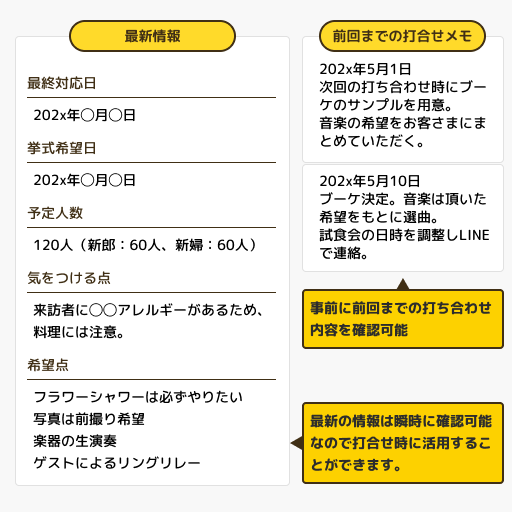 - 衣装、写真、映像、花や装飾など、多くの外部業者との情報共有に時間がかかる。