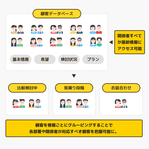 セグメント機能により、例えば「衣装合わせが必要なお客さま」「料理の確認が必要なお客さま」などを絞込み表示することが可能です。これにより各部門ごとに対応が必要なお客さまを把握することが可能です。