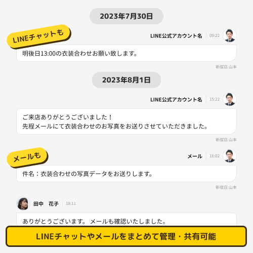 メールやLINEチャットなどをQQURUひとつで管理・共有することが可能です。各スタッフが対応した情報を一元化・共有することができます。