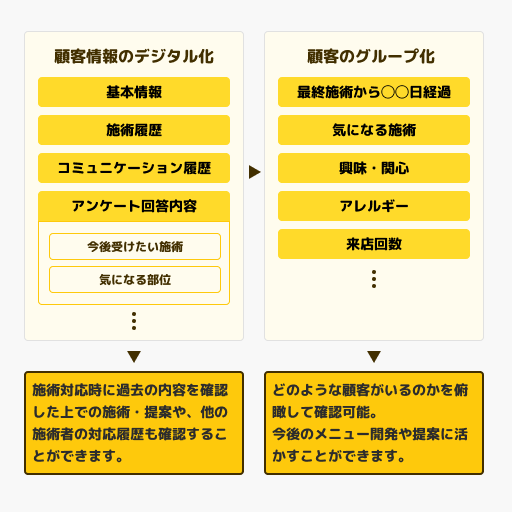 過去の施術内容やコミュニケーション履歴、アンケートなどで収集した「気になる部位・施術」などの情報を元に、顧客一人ひとりに合わせたクーポン配布や情報提供が可能になります。