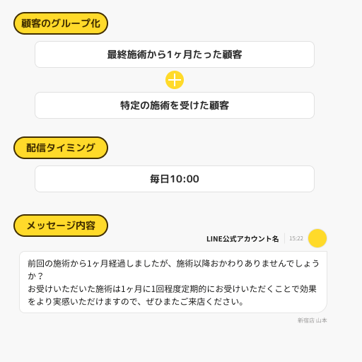 次回の施術案内や「前回の施術から◯◯日たった顧客」に対する施術提案など、自動的にメッセージを送信することが可能。リピート獲得の機会損失を防ぐことができます。