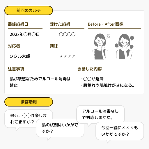顧客ごとに好み、アレルギー、過去の施術や反応、会話した内容、注意点などの詳細情報の管理・共有が可能です。