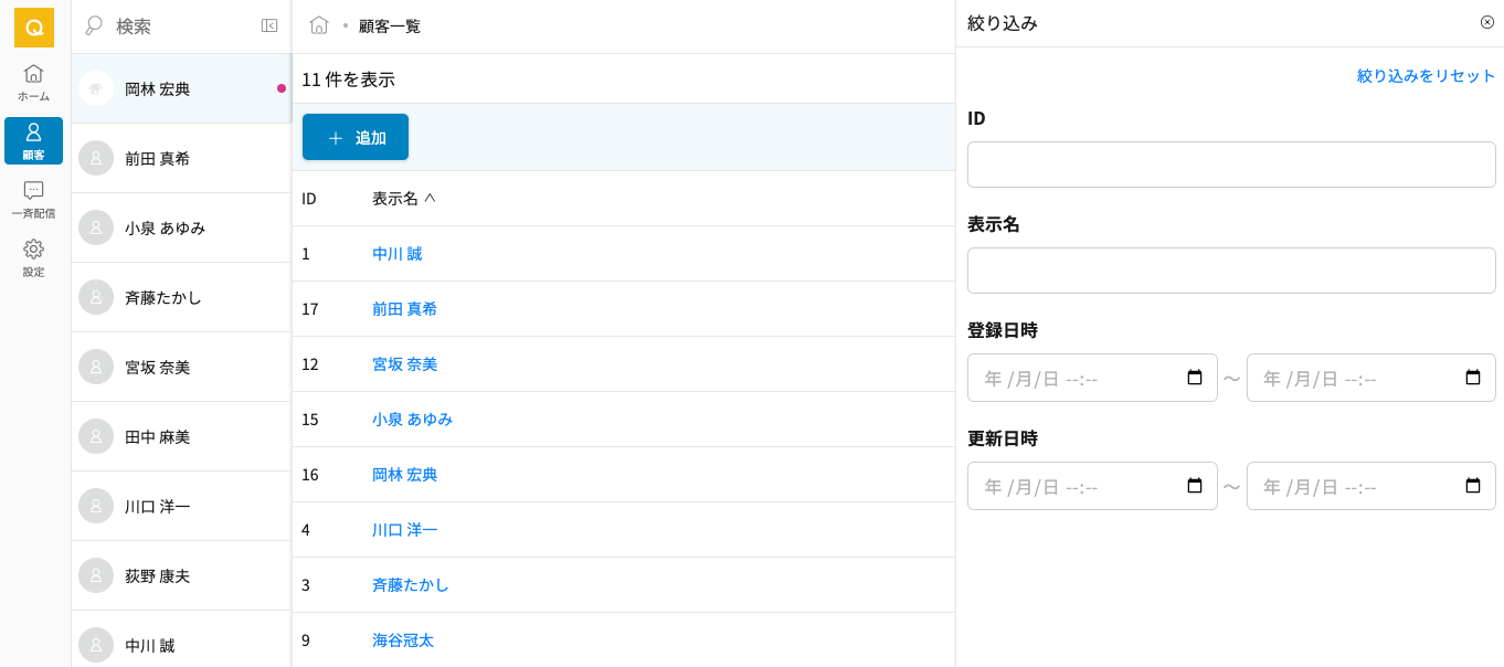 現在は顧客のID、表示名、メールアドレスでの絞り込みが可能です。