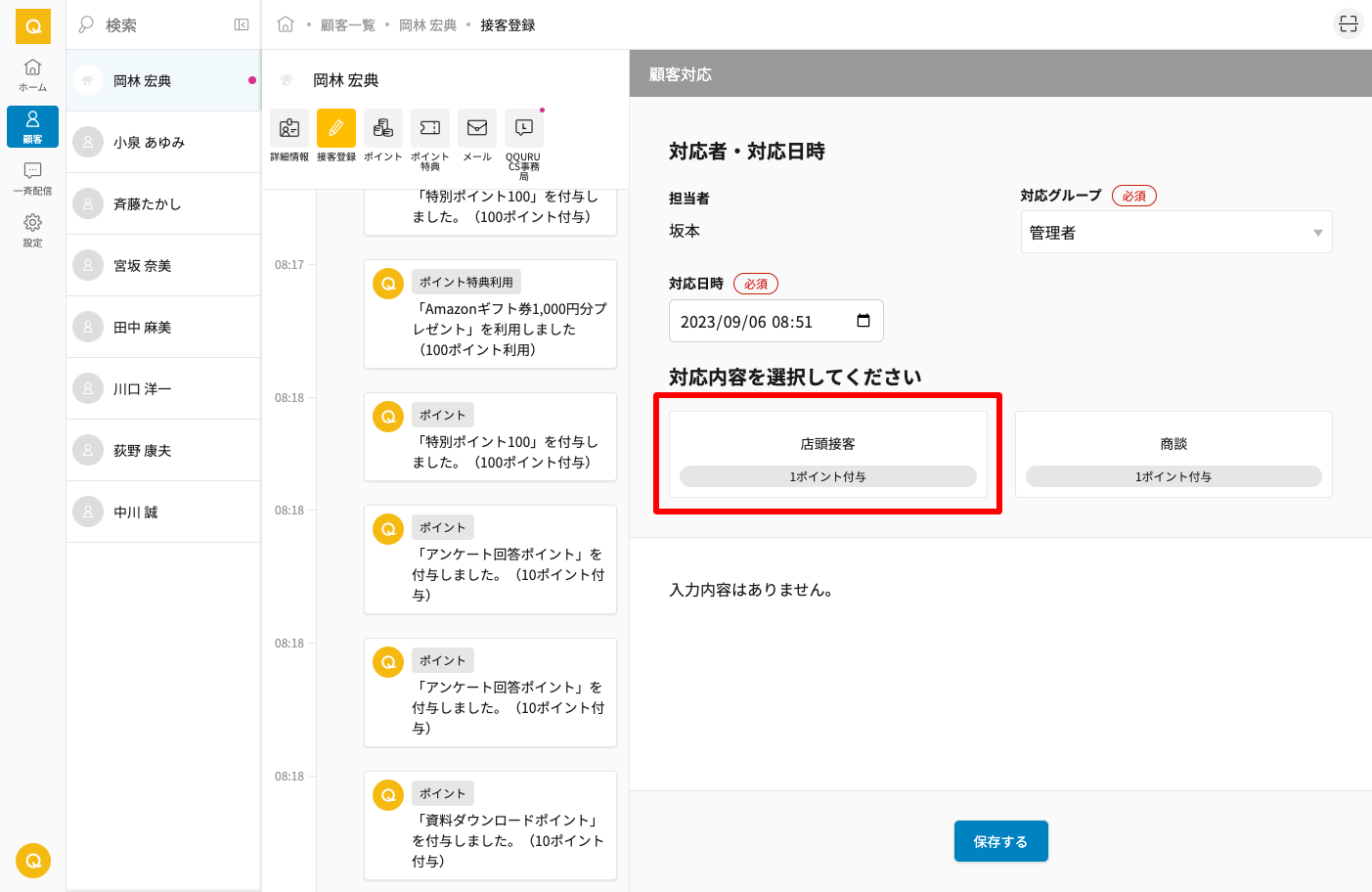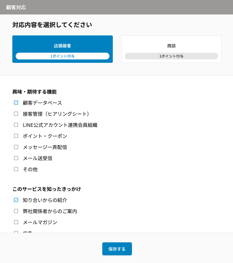 接客対応時や対応後に必要な情報を記録して保存することで、接客記録が登録されます。
