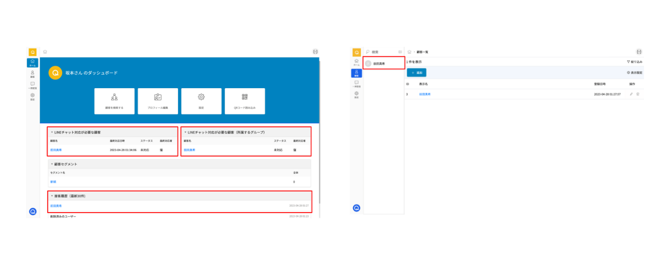 顧客名とは、一度接客したことのある顧客に対して付与される名前で、顧客一覧画面の左バーや、ダッシュボード(赤枠部分)で表示されます。