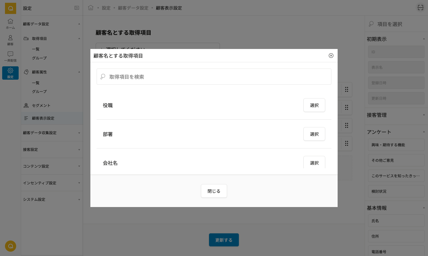 - 2. 顧客名とする取得項目のモーダルを開き、設定したい取得項目を選択してください。