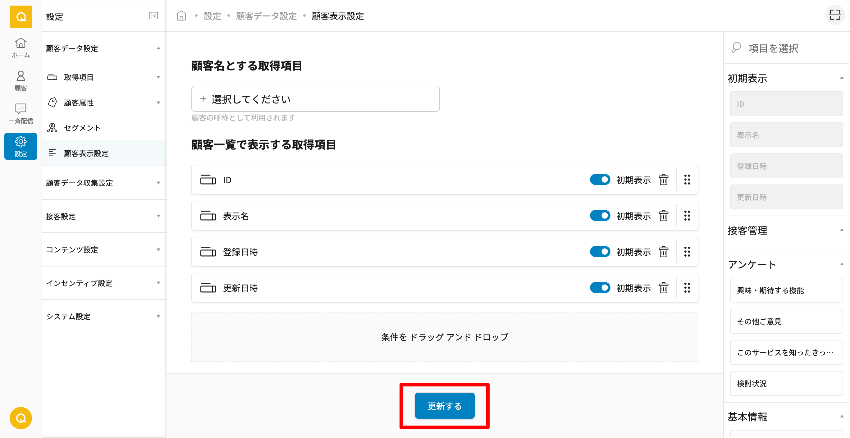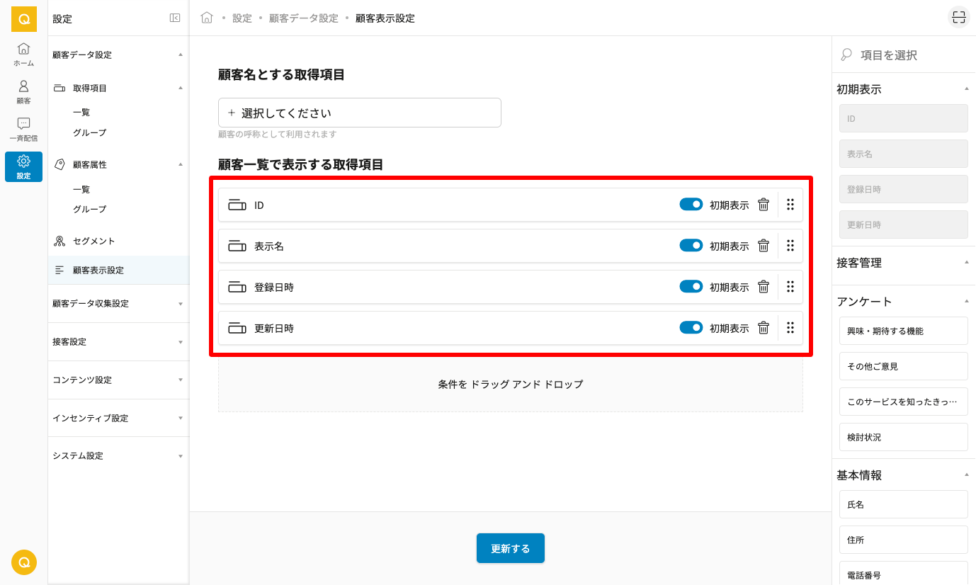 - 3. 顧客一覧で表示する取得項目を右バーから選択し、「条件をドラッグアンドドロップ」へ移動させてください。