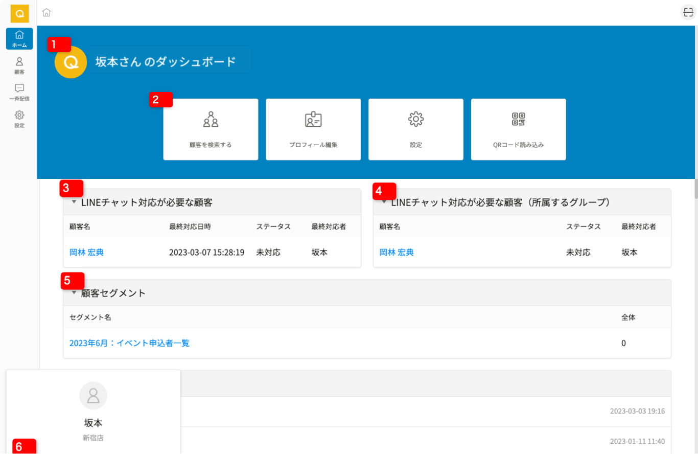 - LINEチャットもしくはメールにおいて、要対応フラグまたは対応中フラグが立っている顧客を対応が必要な顧客とし、そのうちログインした管理者ユーザーが接客(接客記録登録やLINEチャットなど)を行ったことがある顧客が一覧として表示されます。