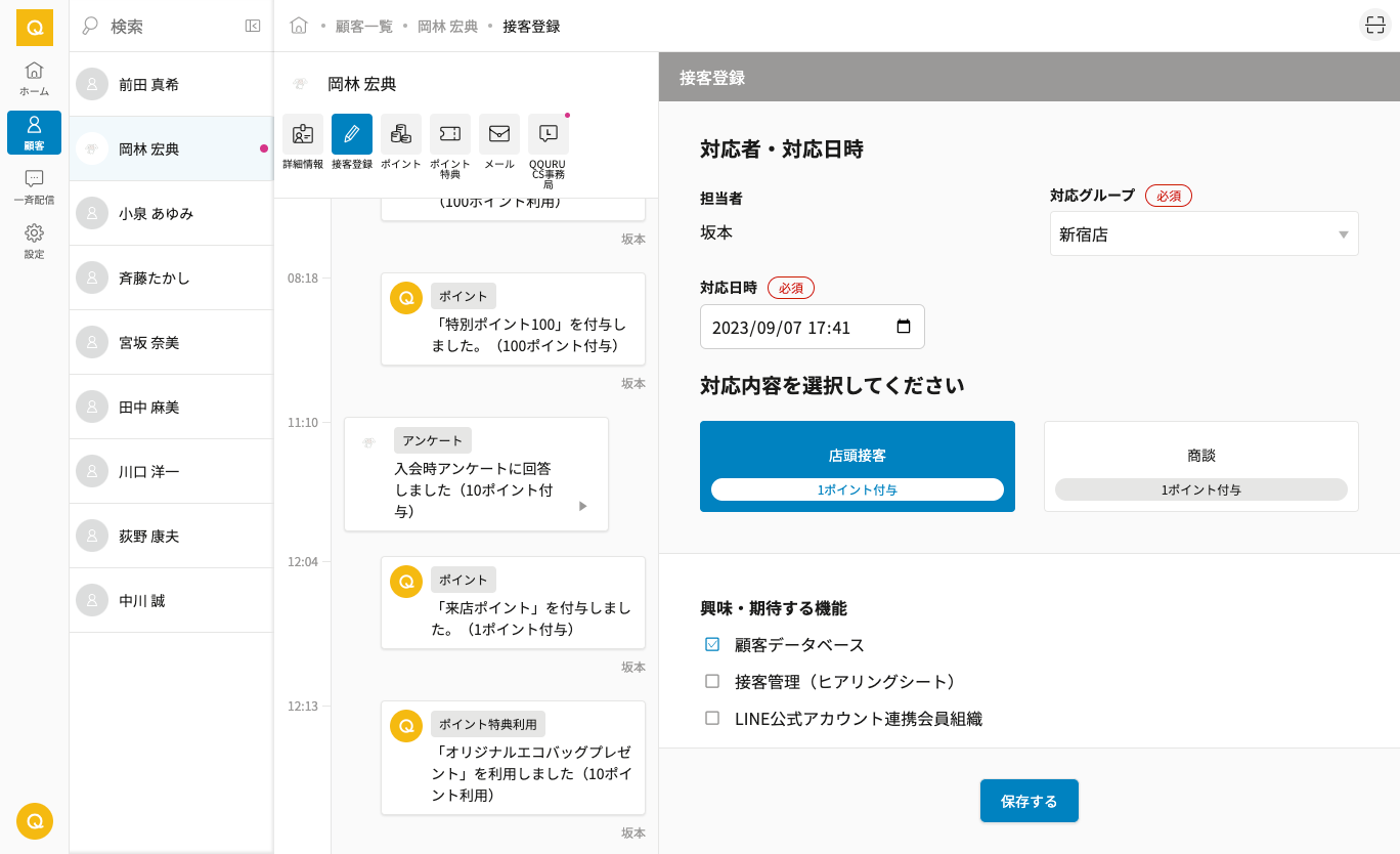 - 付与するポイントを選択することで、接客対応者が接客登録した際に、該当会員に設定されたポイントが自動付与されます。