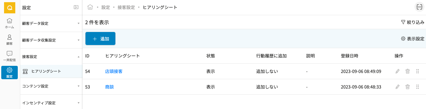 - ONにすると接客対応時のヒアリングシート選択肢として表示されます。