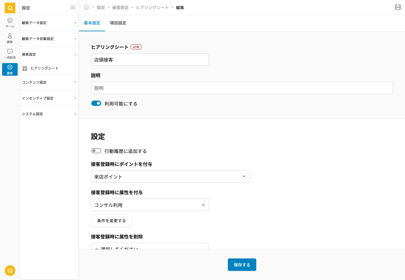 - ONにすると、ヒアリングシート登録時に該当会員のタイムラインに接客履歴が追加されます。