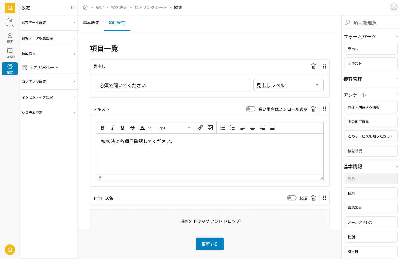 なお、各ヒアリングシートで設定する入力項目は「取得項目」で作成した項目が利用可能です。