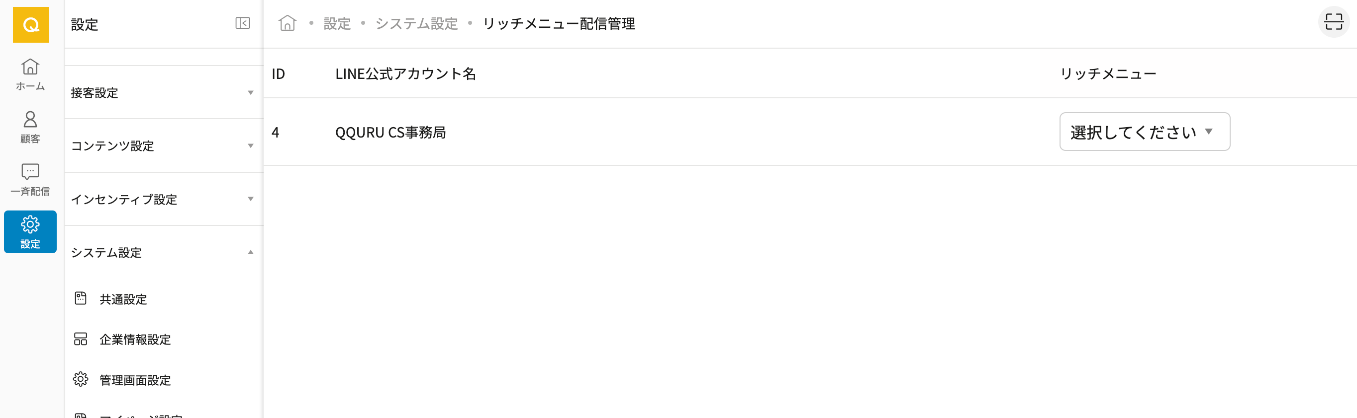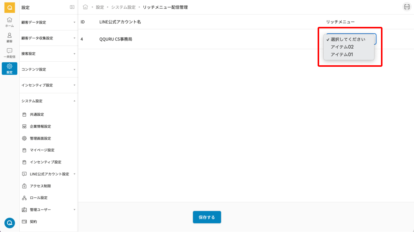 - 3. リッチメニューアイテムで作成した中から設定するリッチメニューを選択します。