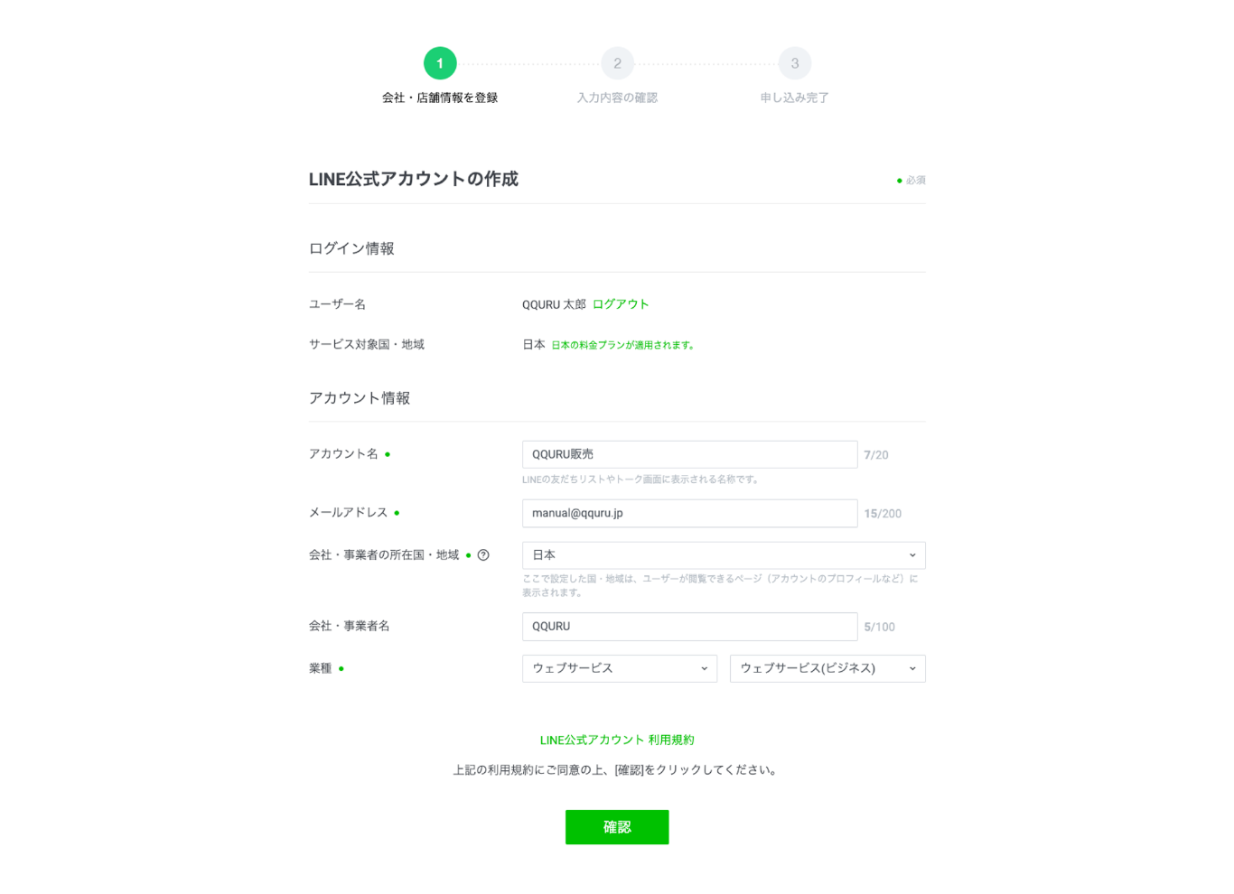 - 1. アカウント名、メールアドレスなど画面に表示された必要事項を入力の上、「確認」を押下してください。