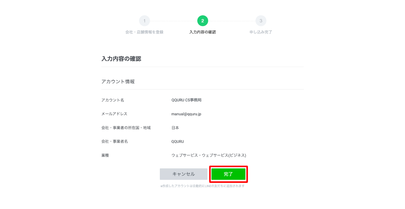 本画面で認証済みアカウント申請を行うことも可能ですが、未認証アカウントでもQQURUの設定を進めることができます。