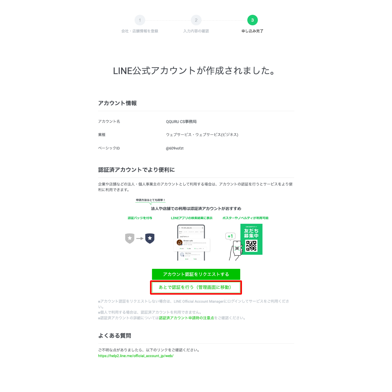 - 3. LINE公式アカウント作成完了。「あとで認証を行う(管理画面に移動)」を押下