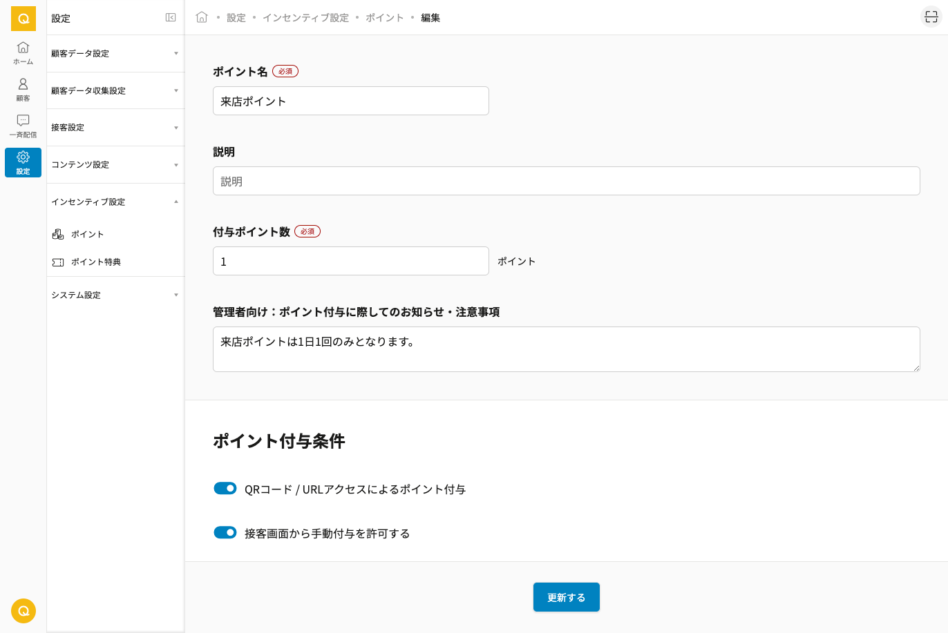 - ONにすることで、QRコードやURLアクセスによるポイント付与を行うことができます。