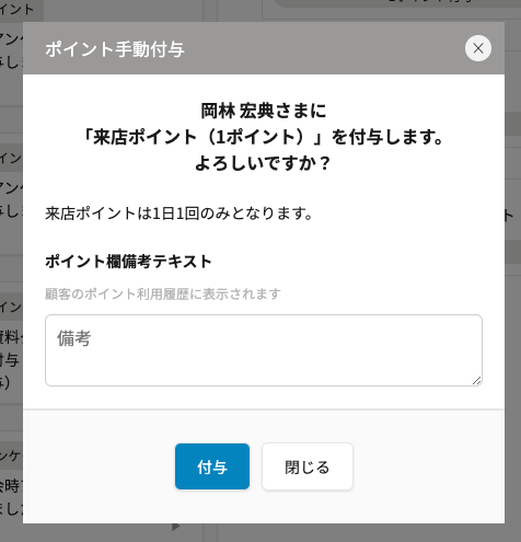 - 管理者画面から手動でポイントを付与する際に付与者に対してのお知らせや注意事項を表示することができます。
