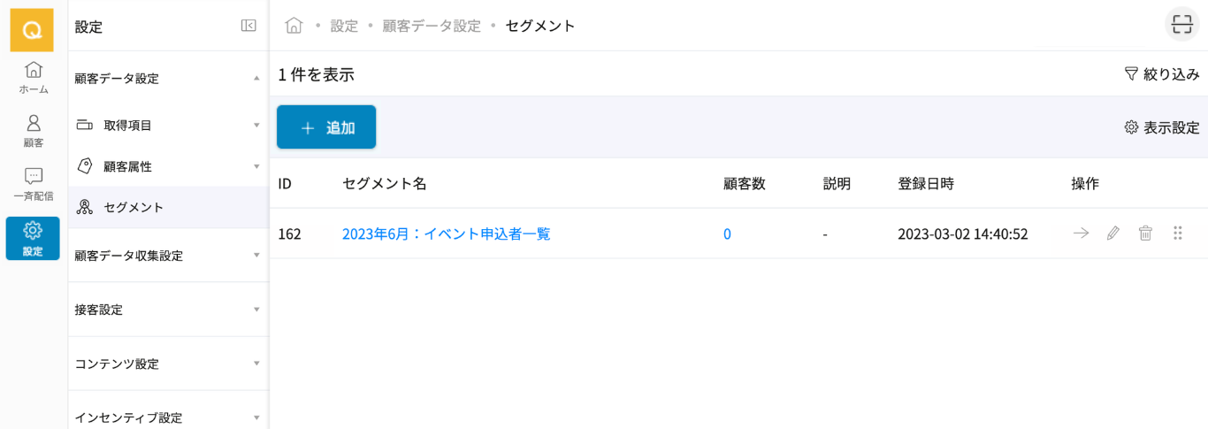 新しいセグメントを作成する場合は帳票上部の「追加」を押下してください。