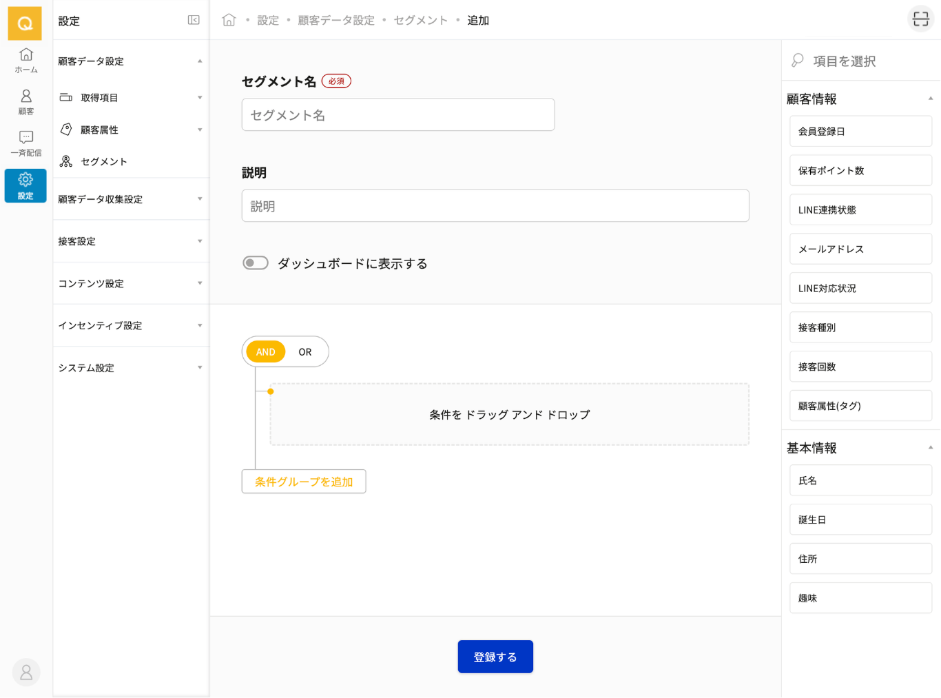 セグメントは顧客情報または取得項目で設定した項目に対して条件を定義することができます。